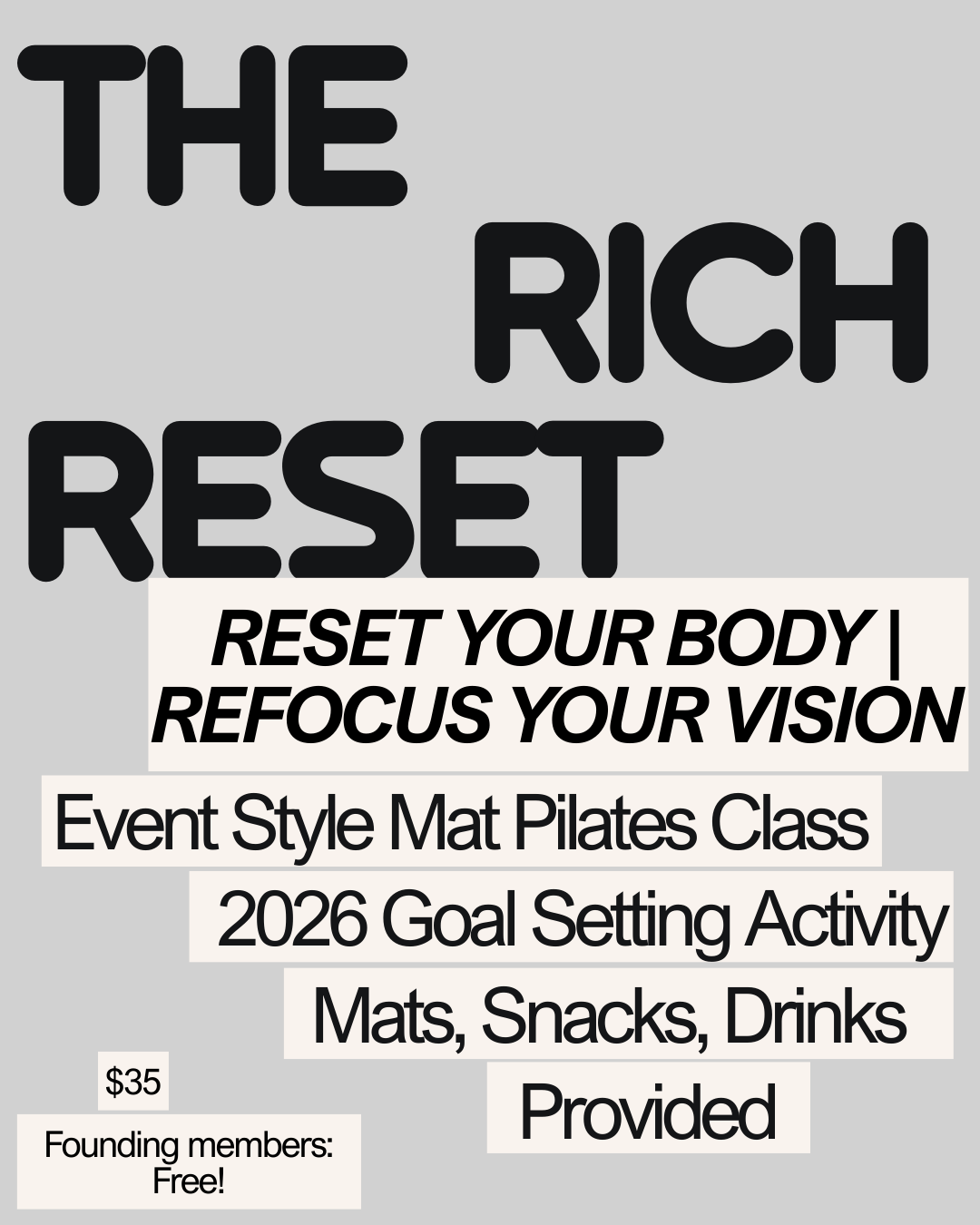 The Rich Reset is an event-style mat Pilates class designed to help you reset with intention — and have some fun doing it. We’ll move hard, get honest about the wins we’re chasing this year, and build custom bingo cards to track progress and celebrate those imminent victories along the way. Then we’ll slow it down, connect, and fuel up with snacks and drinks. You’ll leave clearer, stronger, and motivated — with a plan you’ll actually use.