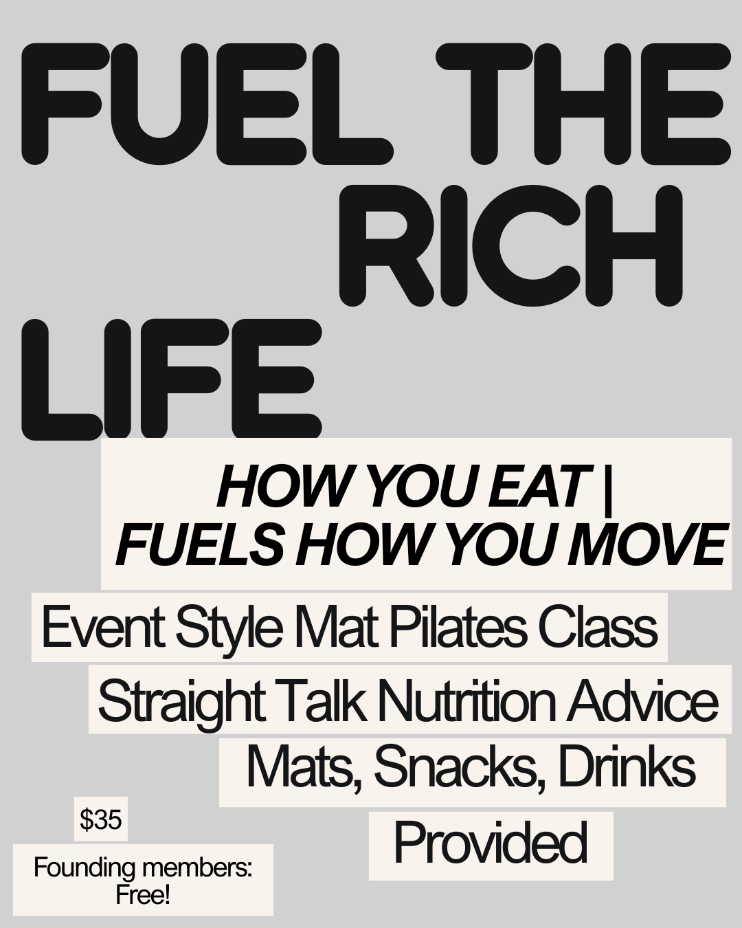 Rich Movement Pilates Pop-Ups are event-style mat classes — focused, challenging, and intentional. Get a powerful mat workout plus extras like goal setting, straight-talk nutrition coaching, and practical wellness tools. Come move, connect, and experience our vibe while we count down to the full studio opening.