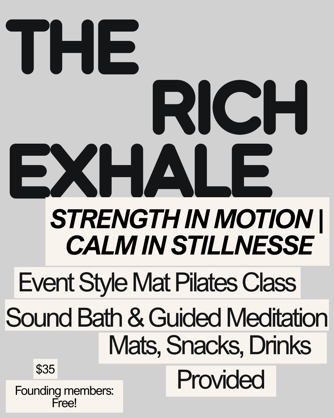 The Rich Exhale is designed to strengthen your body and calm your mind. Start with a full-body mat Pilates flow to build strength, then drift into a restorative sound bath and guided meditation with Jaida Bentley to release tension and reset your energy. Curated snacks and drinks provide the perfect finishing touch. Leave feeling balanced, renewed, and deeply restored — body and mind in harmony.