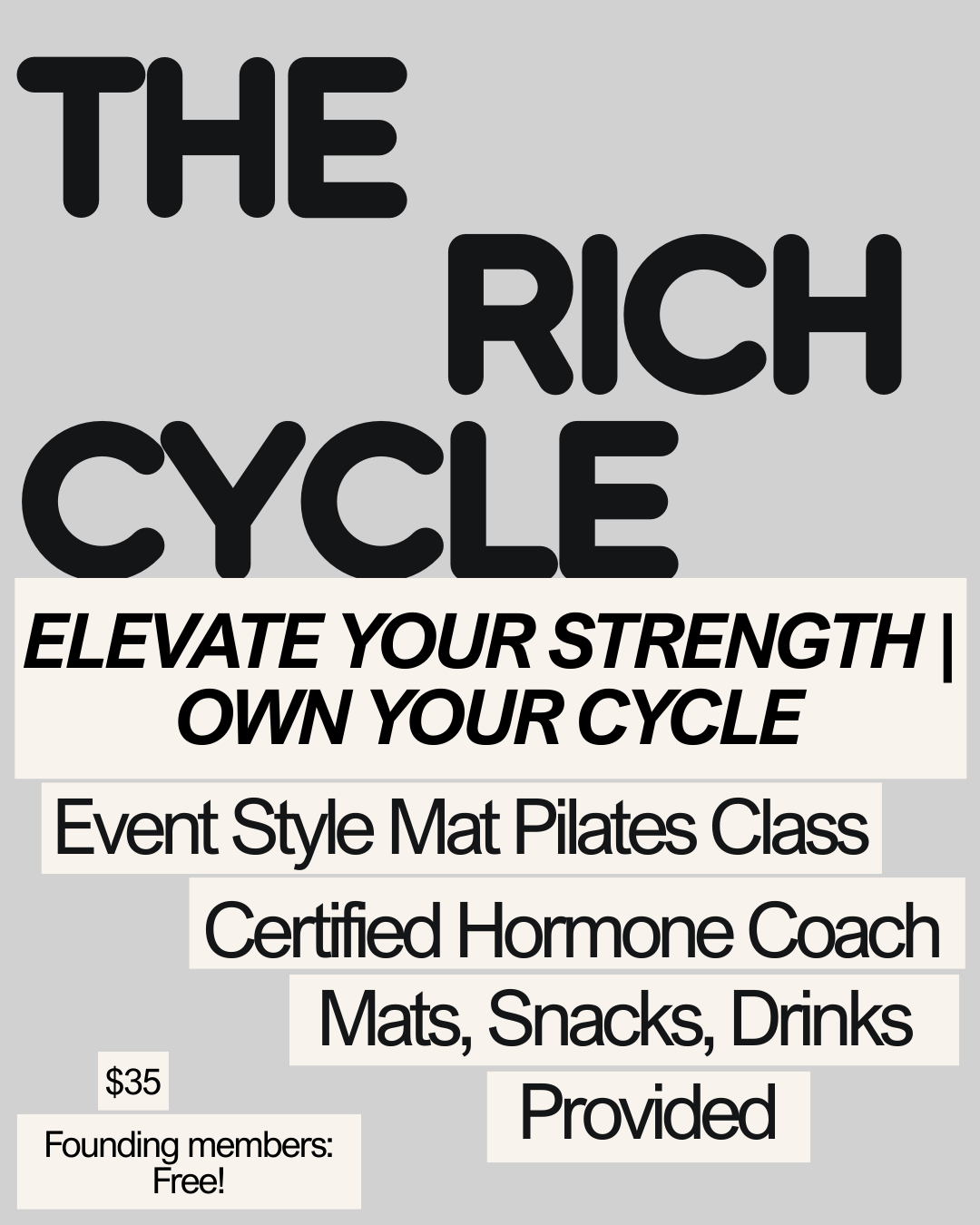 The Rich Cycle blends movement and knowledge to help you feel strong, balanced, and in sync with your body. Move through an empowering mat Pilates class, then dive into insights with Lizzi, Certified Hormone Coach, to better understand your cycle, optimize energy, and feel your best. Finish with connection, snacks, and drinks. Leave stronger, smarter, and more aligned with your body than ever.
