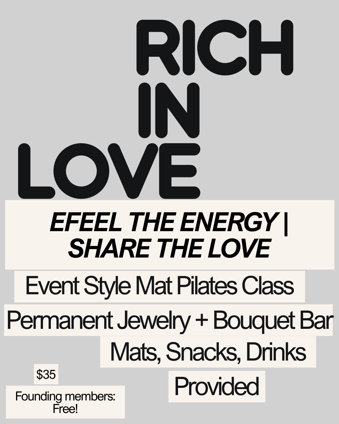 Rich in Love is a Valentine’s Day celebration for your body, heart, and mind. Flow through a heart-opening mat Pilates session, connect with others, and soak in joyful, uplifting energy. After class, enjoy permanent jewelry by Amber Carter and create your own flower bouquet to take home. Curated snacks and drinks round out the experience. Leave feeling strong, celebrated, and full of love — for yourself and the moment.